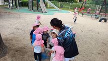 蒸し暑さの残る日でしたが、木陰の中で水遊びを一緒に楽しんだり、園庭で捕まえたセミを子どもと一緒に見たり、保育室内でゆったりと過ごして過ごしました。